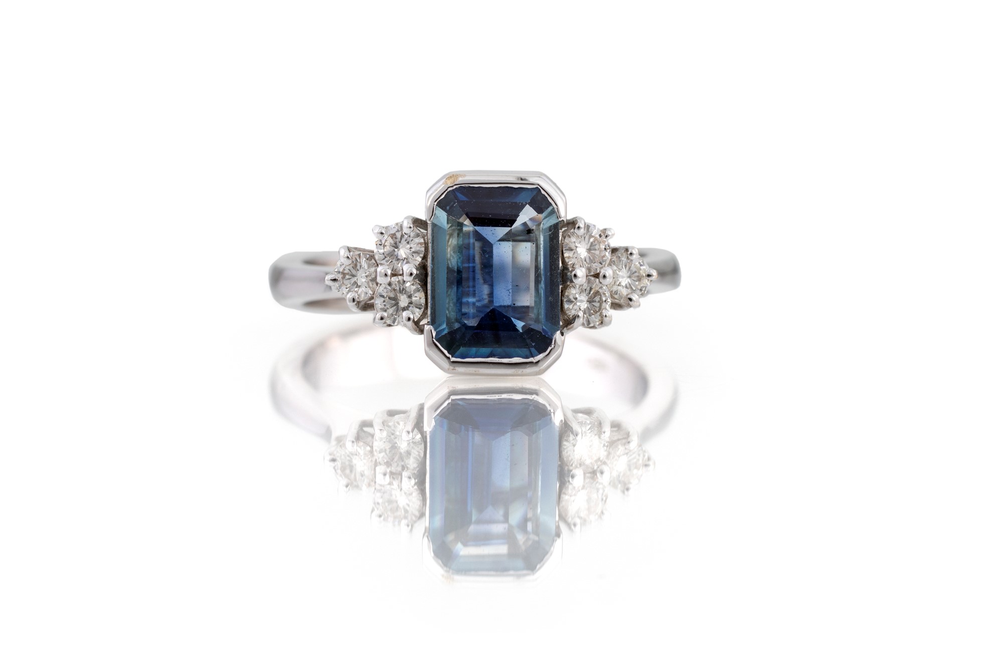 ANELLO ZAFFIRO TAGLIO RETTANGOLARE - di Ceylon ct 1,32, brillanti ct0,28, oro bianco 750/000, g 5