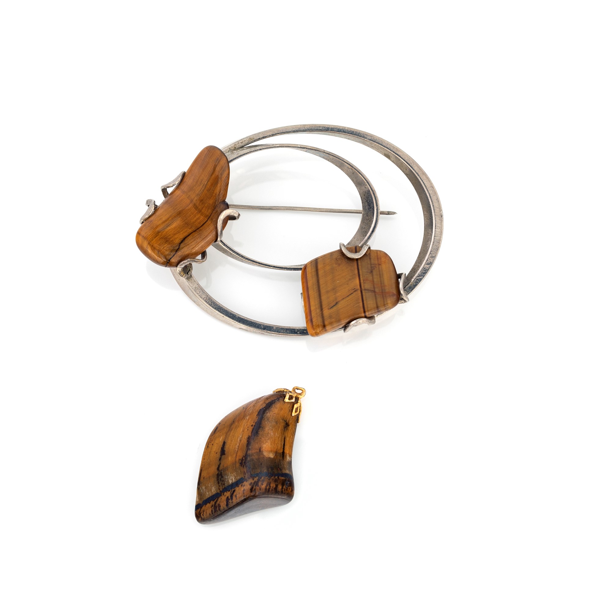 LOTTO CON OCCHIO DI TIGRE - spilla con movimenti ad ellisse e ciondolo con artiglio in occhio di tigre.