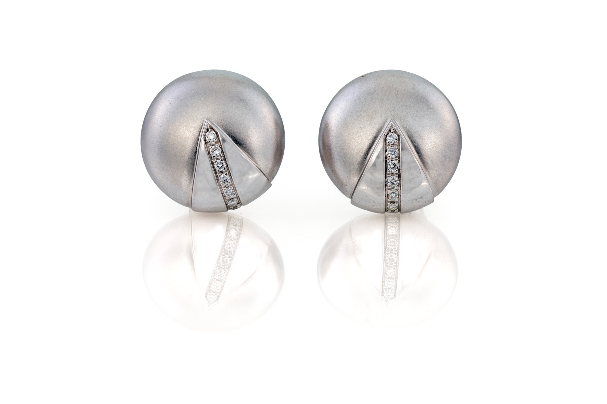 ORECCHINI A BOULE - in oro bianco 750/000 a clip con boule sabbiata e brillanti, g 16,30, diametro 19 mm
