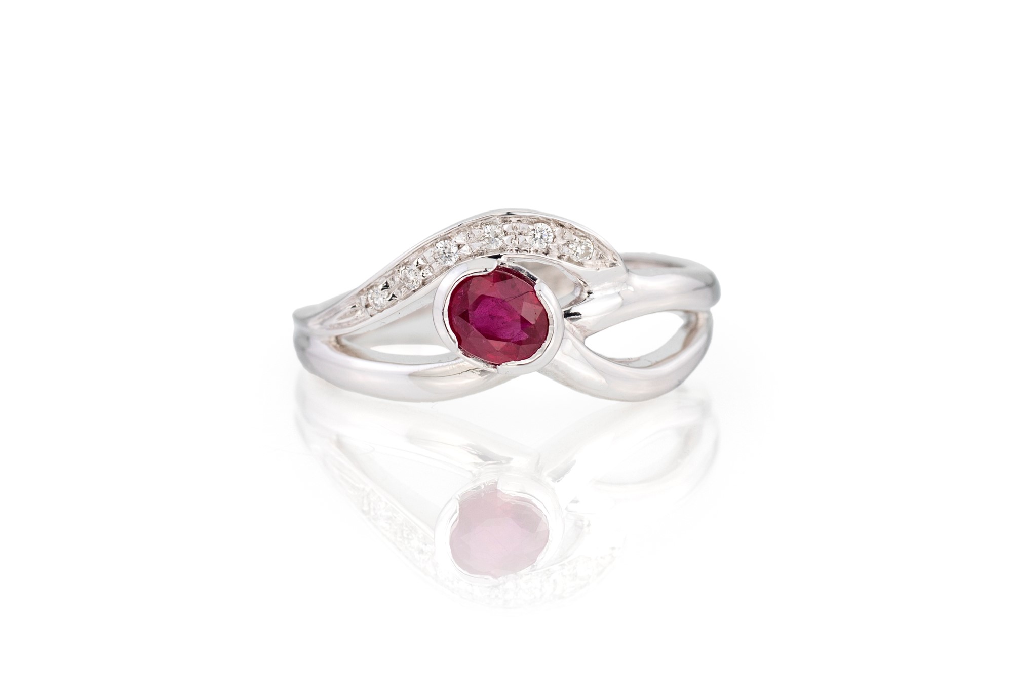ANELLO CON FILI INTRECCIATI - in oro bianco 750/000, rubino ct 0,50, brillanti ct 0,04, g 3,60