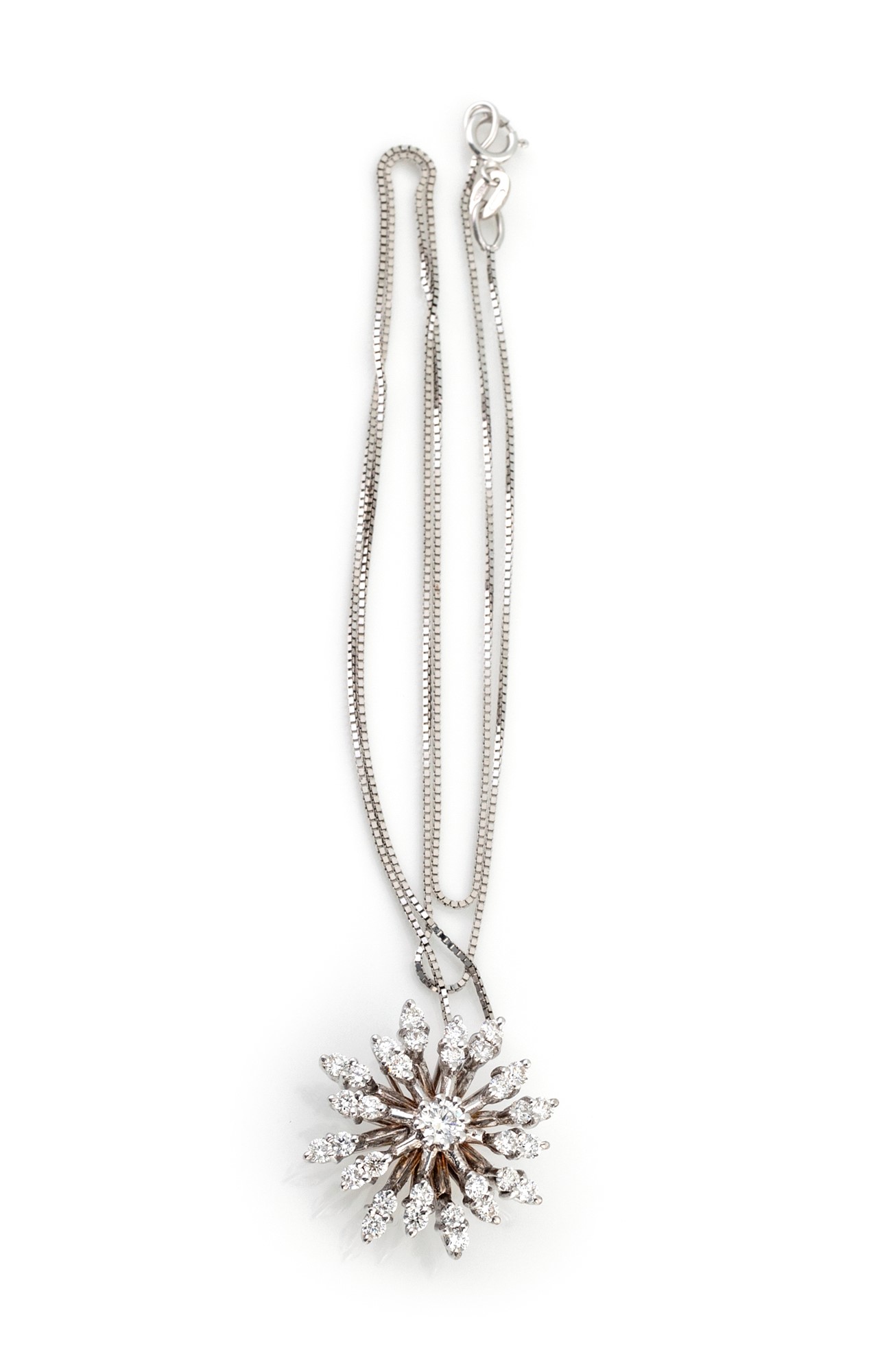 CIONDOLO FIOCCO DI NEVE - in oro bianco 750/000 con diamante centrale e steli di brillanti su due altezze ct, 1,14 G color - vvs, catenella San Marco.