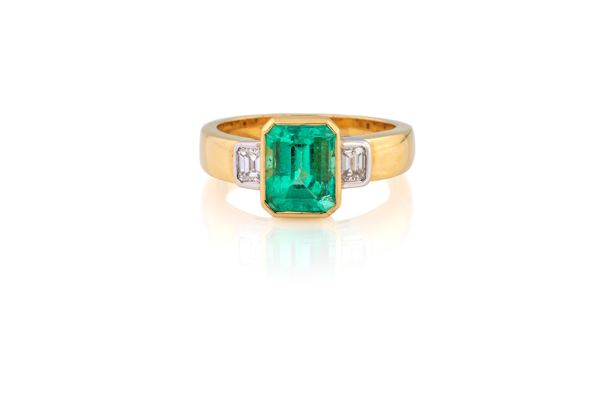 SOLITARIO CON SMERALDO - Colombiano di ct 2,30 su montatura in oro giallo 750/000 con due diamanti taglio smeraldo ct 0,40 colore G - Vs, g 8,20