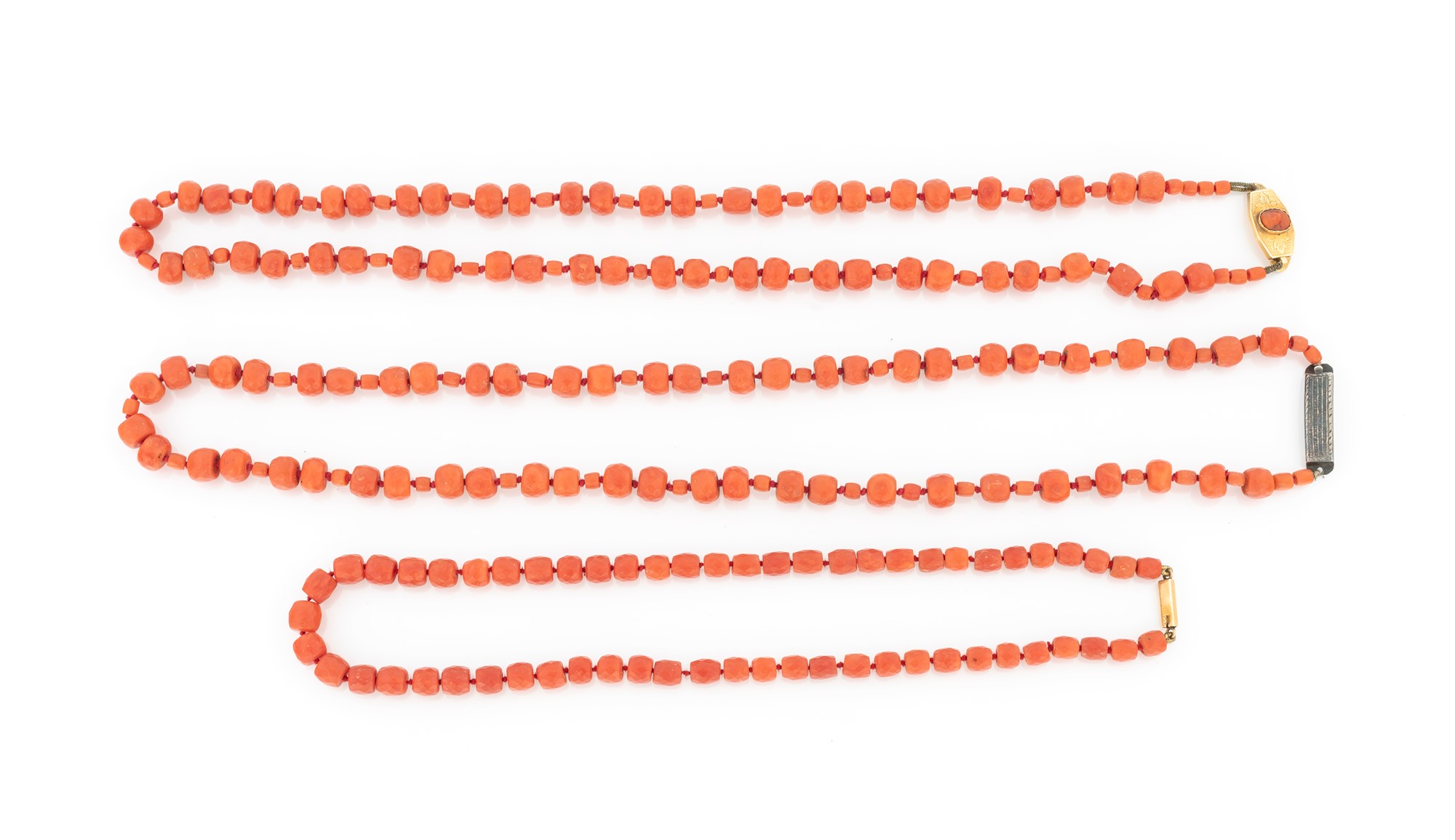 TRE FILI DI CORALLO BARILOTTO - con chiusure in argento e oro, lunghezza cm 64 cad, g 135