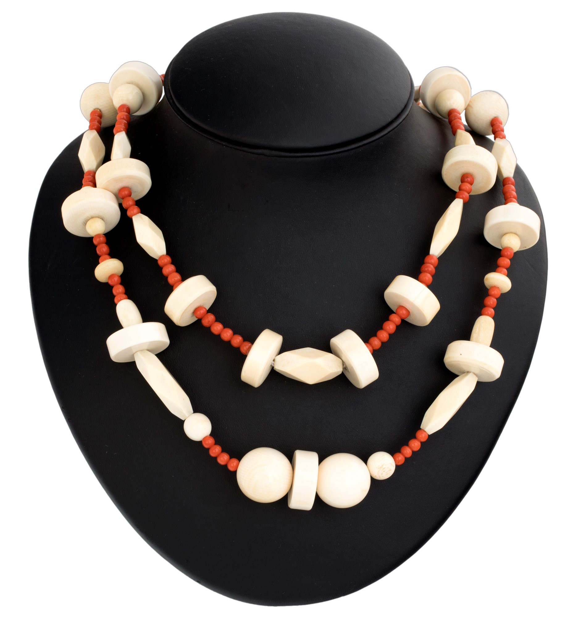 LUNGA COLLANA DI CORALLO E AVORIO - con tondi piatti mm 24, sfere mm 18, segmenti sfaccettati mm 25, intervallati da palline di corallo rosso mm 5. Lunghezza filo cm 112