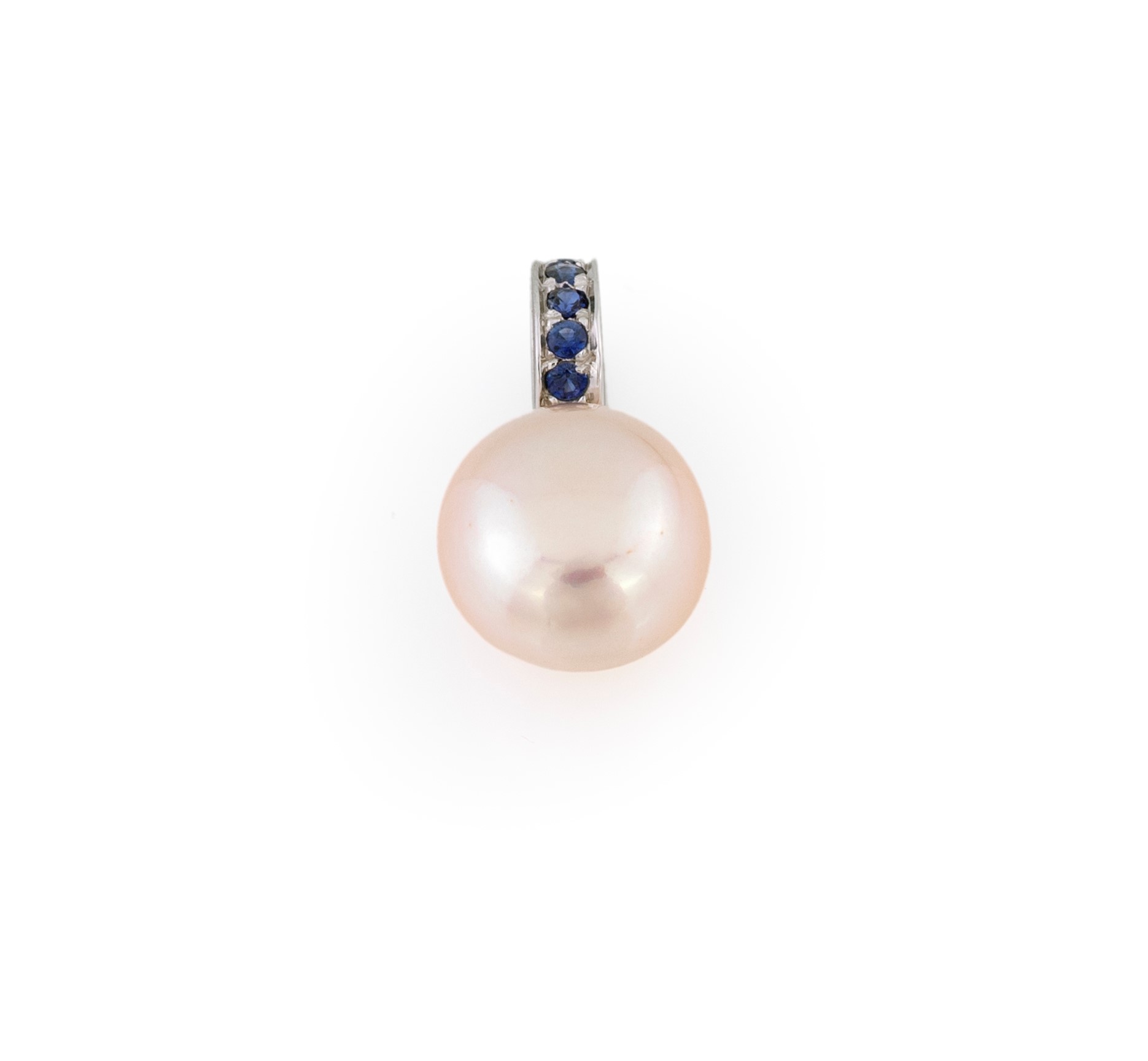 CIONDOLO CON PERLA BAROCCA - in oro bianco 18 kt con zaffiri e perla rosa freshwater, g 2,40