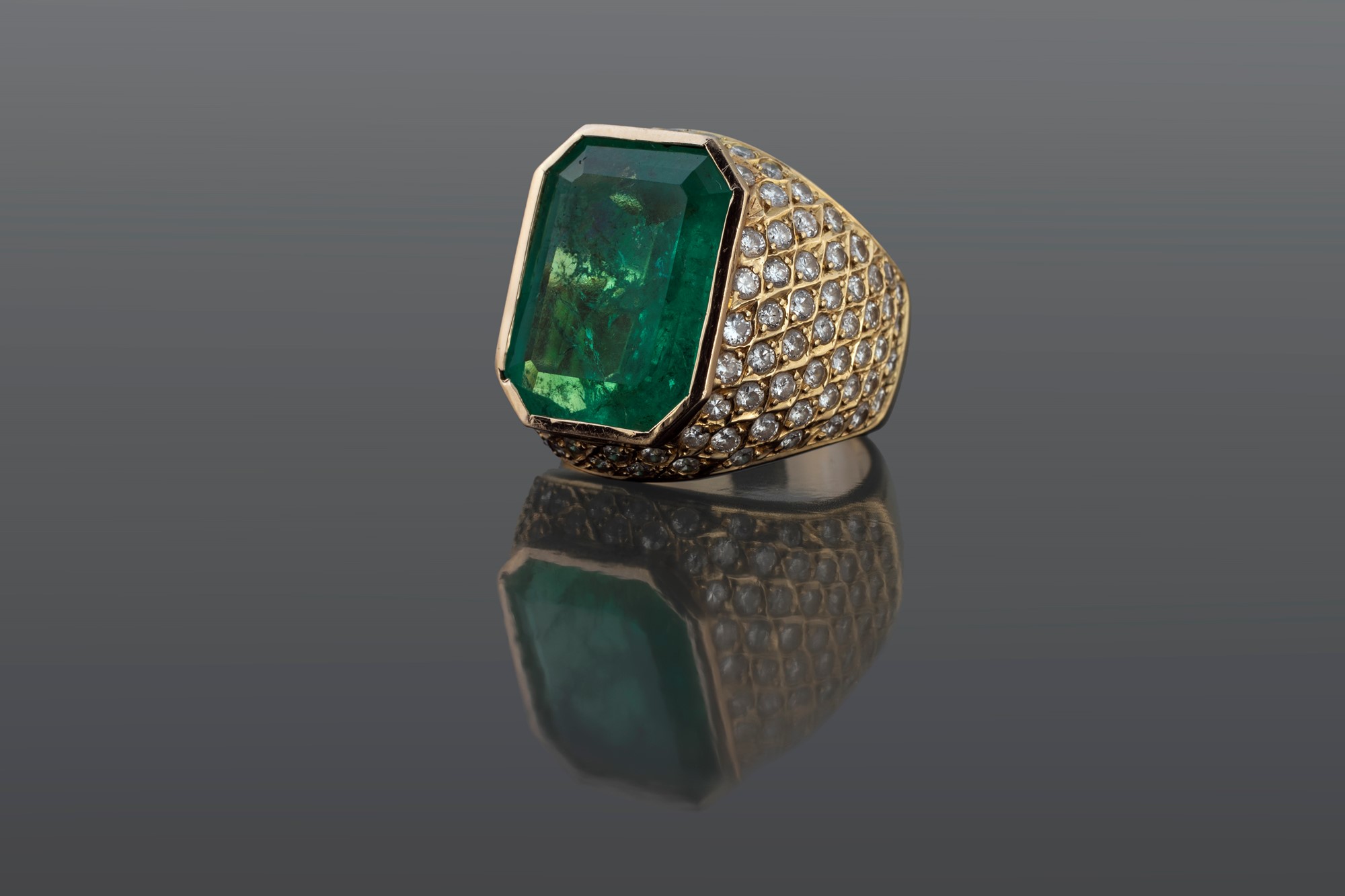 ANELLO CON SMERALDO COLOMBIANO - ct 10,20 circa di forma ottagonale su montatura in oro giallo 750/000 impreziosita con 115 brillanti ct 2,15 circa, g 15,15. Verifica gemmologica di Alberto Scarani, IGI Antwerp Graduate Gemologist.