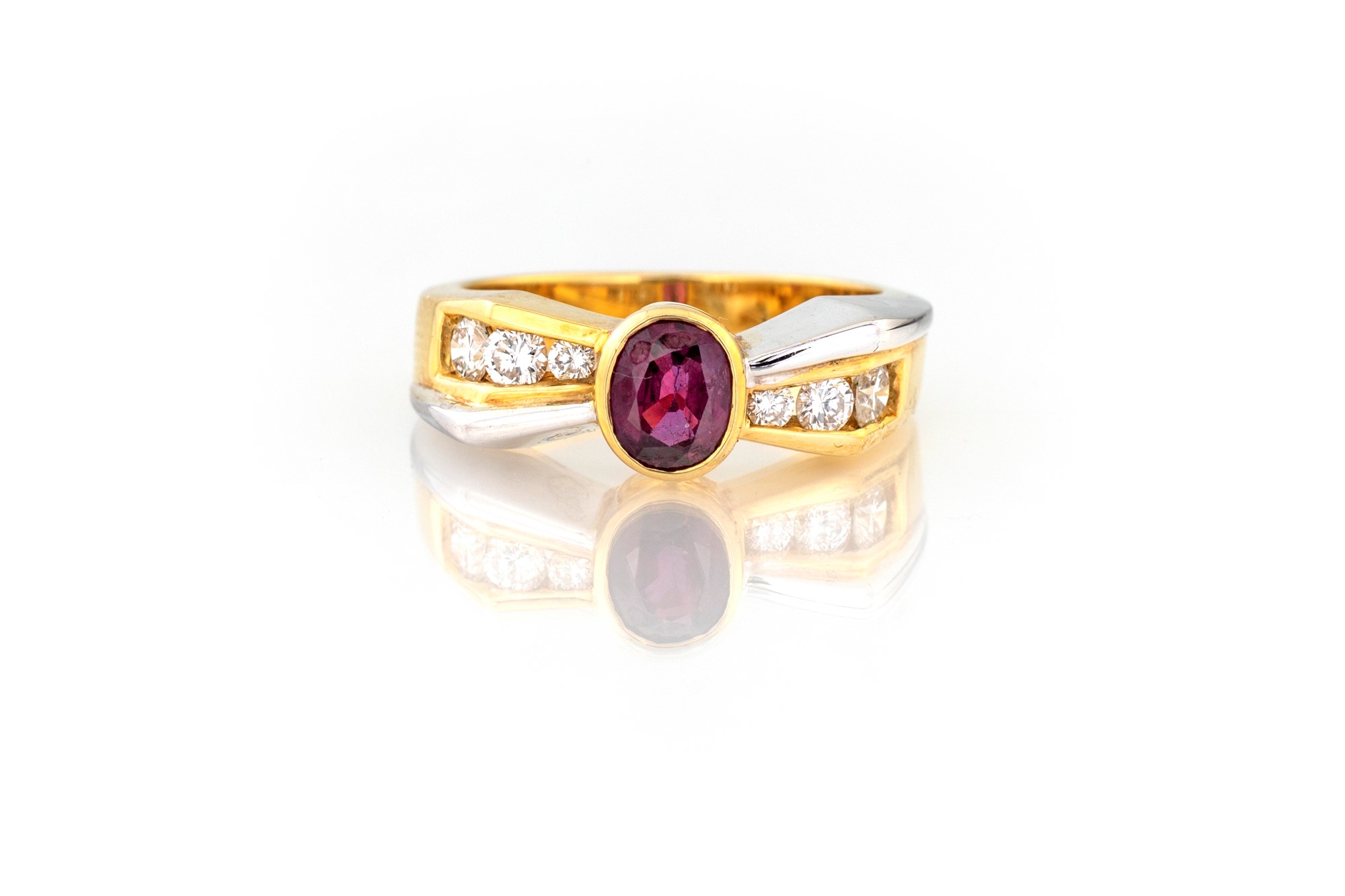ANELLO CON RUBINO SIAM - in oro giallo e bianco 750/000 con 6 brillanti.