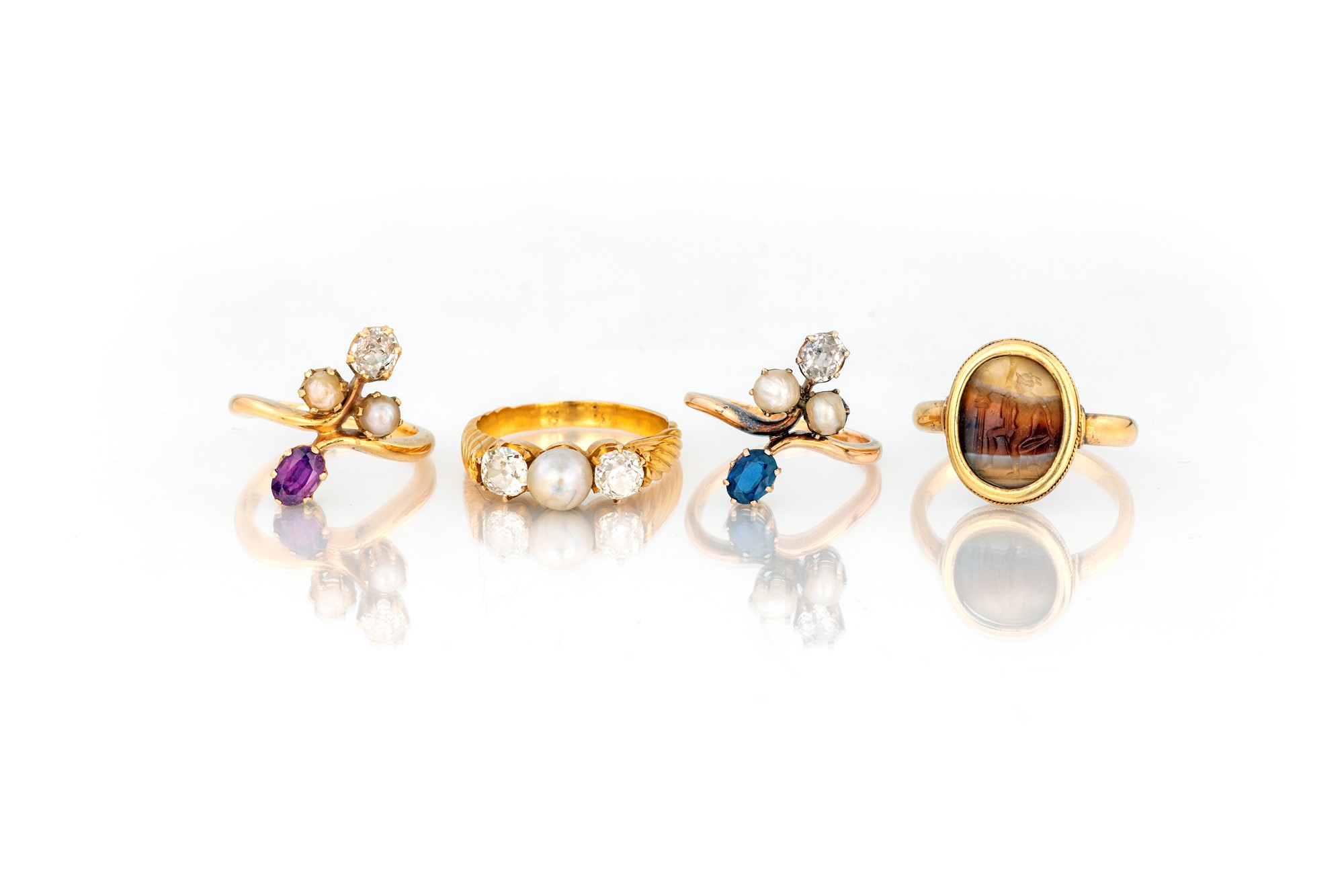 ANELLI CON BRILLANTI, PERLE E PIETRE - 4 anelli con montatura in oro giallo 750/000 g 12,60