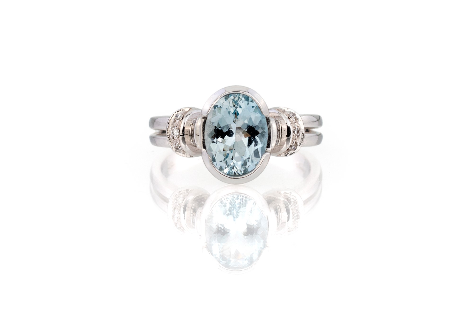 ANELLO CON ACQUAMARINA - taglio ovale ct 1,60, brillanti ct 0,05, oro bianco 750/000, g 6.00