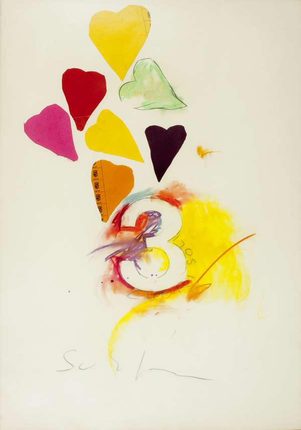 Mario Schifano Tre cuori soli, 1981 tecnica mista e collage su cartoncino, cm. 100x70 Firma in basso al centro Autentica dell'artista su foto in data 22.2.1988 Certificato di Garanzia a cura di Italiana Arte, Busto Arsizio, in data 22.2.1988 Etichetta al verso: Italiana Arte, Busto Arsizio