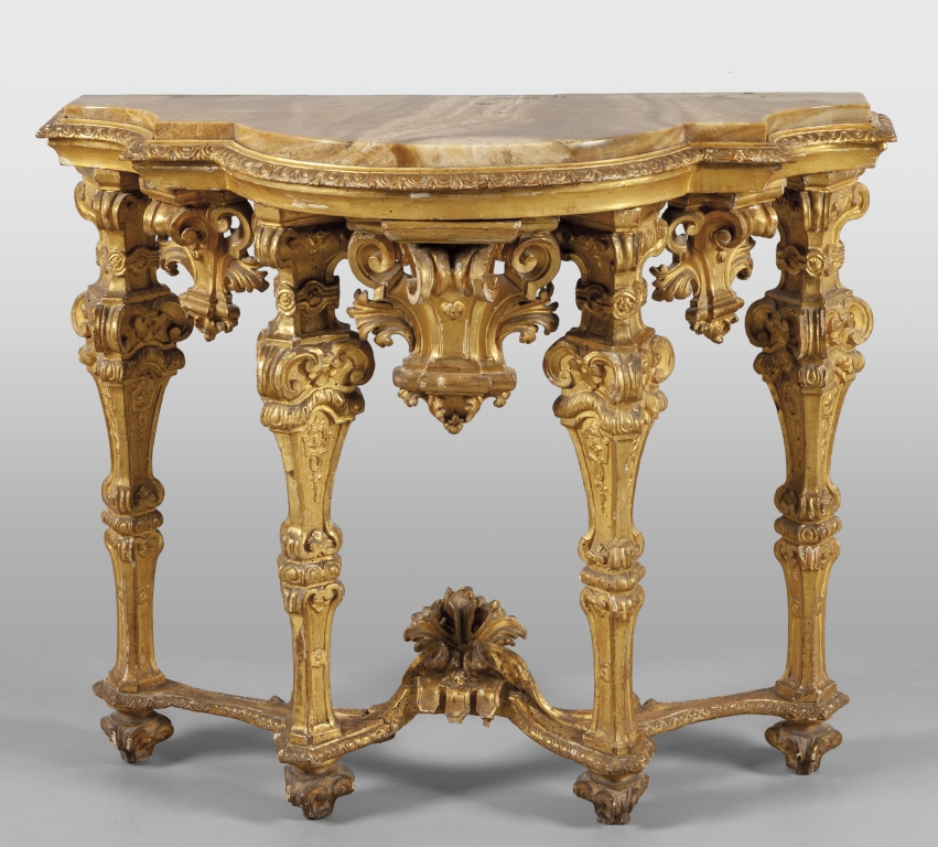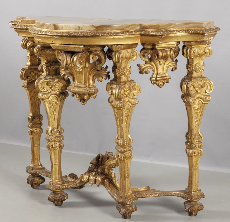 Console Luigi XIV in legno intagliato e dorato piano in onice Genova inizi sec.XVIII