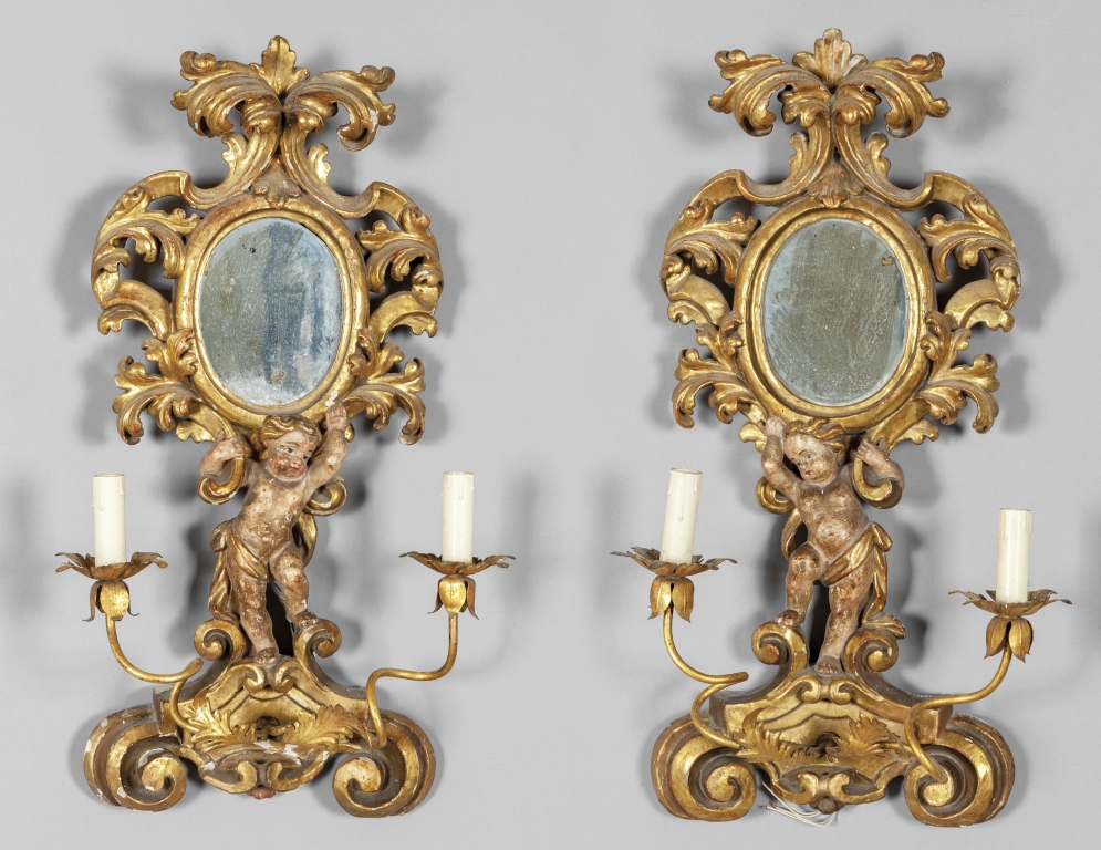 Coppia di reliquari Luigi XIV in legno finemente intagliato e dorato parte superiore sorretta da un putto in policromia Emilia sec.XVIII