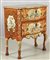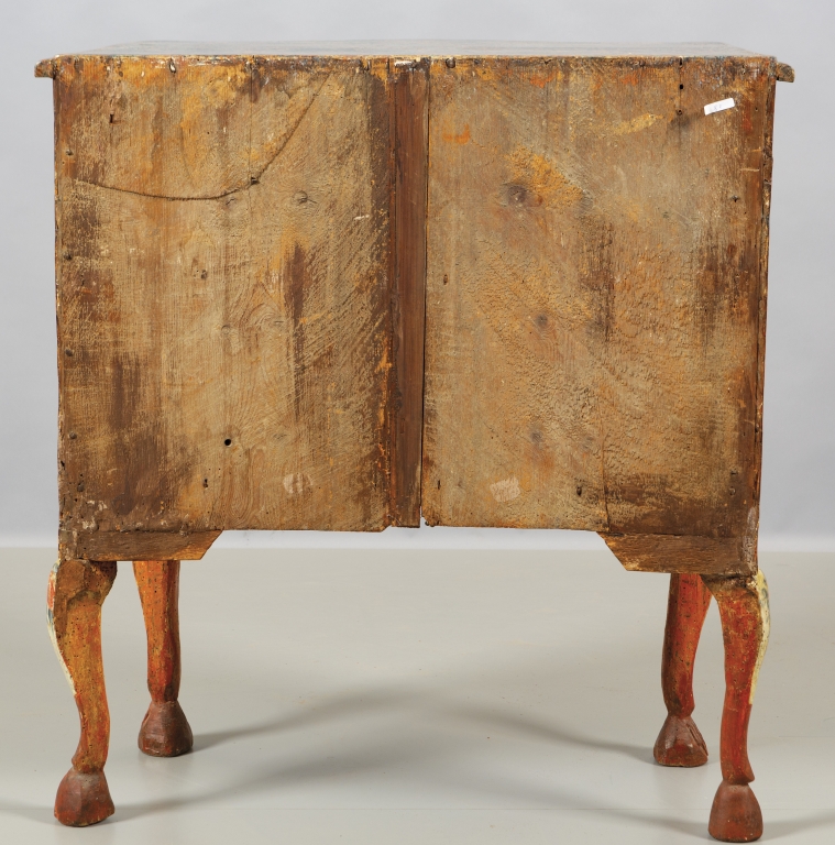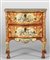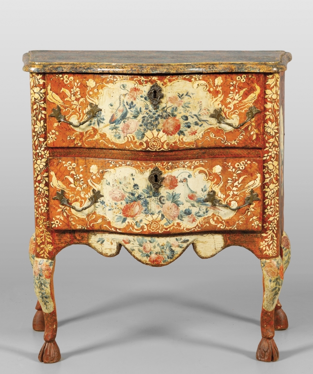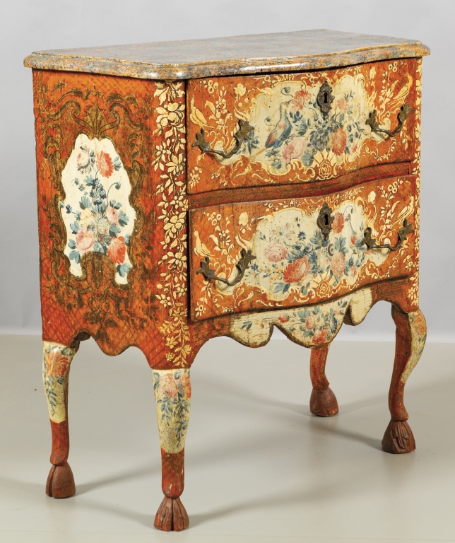 Cassettone Luigi XIV in legno laccato rosso fronte e fianchi abbelliti da fiori policromi su fondo avorio entro riserve sagomate incorniciate da volute fianchi mossi due cassetti sul fronte e grembiulino sagomato gambe mosse terminanti a zoccolo Sicilia I metà sec.XVIII