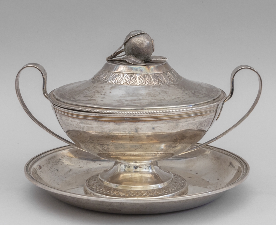 Zuccheriera con manici e sottopiatto in argento presa a forma di melograno Torino inzi sec.XIX