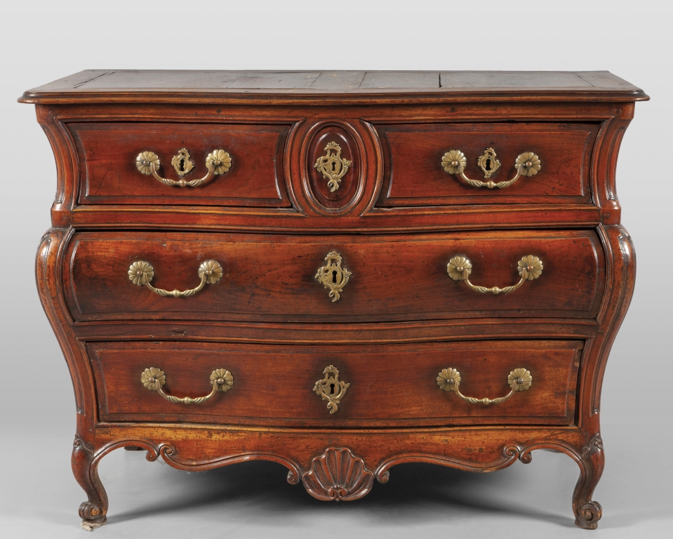 Comò Luigi XV in ciliegio due cassetti più due con cassetto centrale segreto movimentato sul fronte e sui fianchi bronzi d'epoca Provenza I metà sec.XVIII