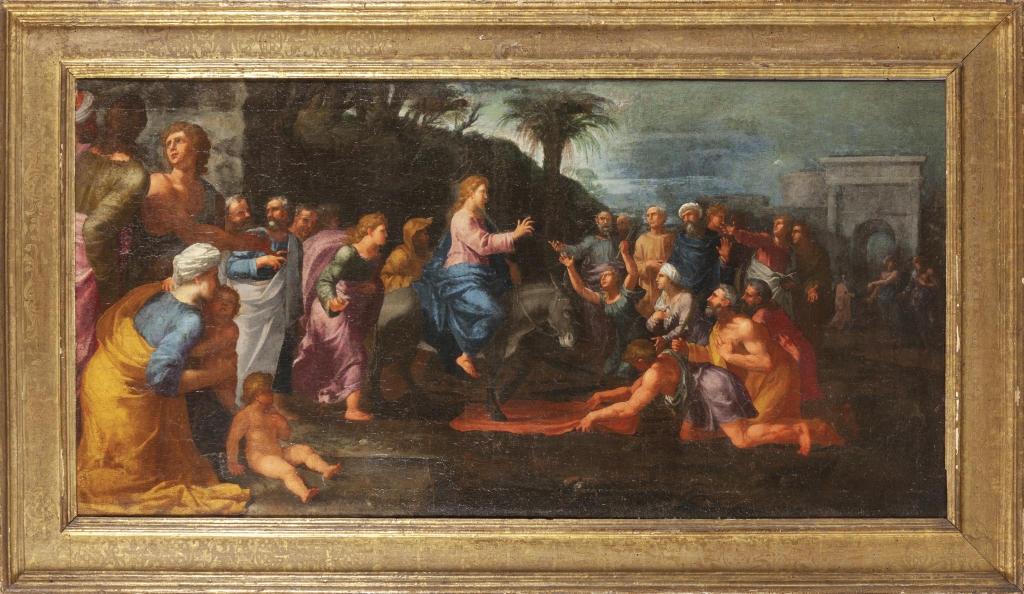 Scuola veneta sec.XVII 'La predica del Cristo' olio splendida cornice in legno intagliato dorato e bulinato