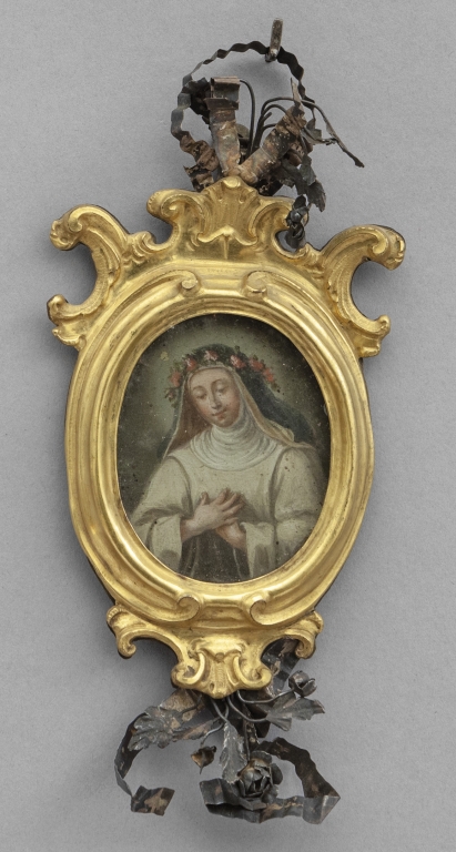 Santa Rita olio su rame cornicetta in bronzo dorato arricchita con fiori in argento Italia Meridionale sec. XVIII