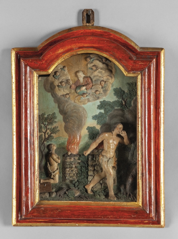 Caino e Abele terracotta policroma cornice laccata sec.XVII