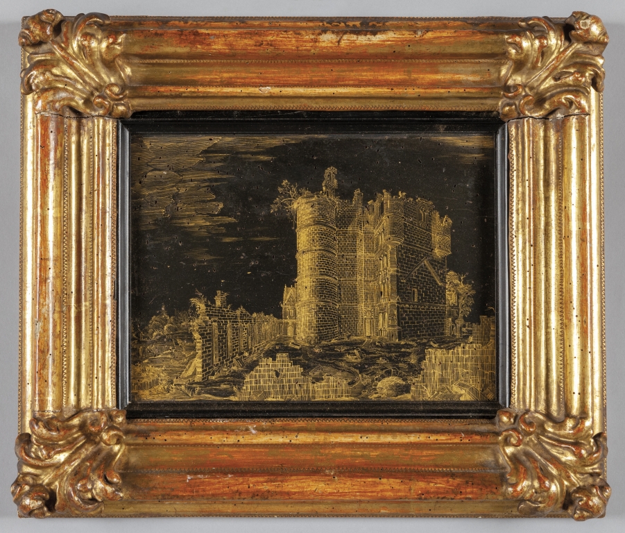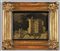 Scuola lombarda sec.XVII 'Paesaggio con rovine' dipinto a foglia d'oro su legno cornice Luigi XIV in legno dorato