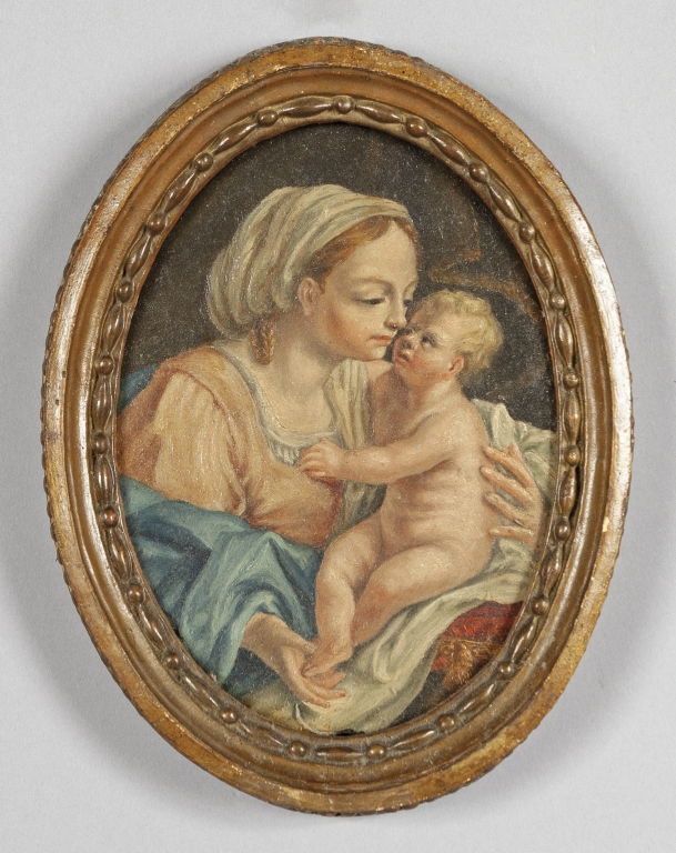 Scuola italiana sec.XVIII 'Madonna con Bambino' olio su ardesia di forma ovale cornice coeva in legno intagliato e laccato
