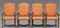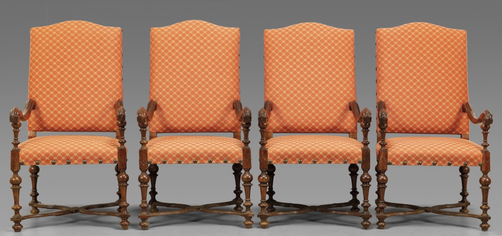 Quattro poltrone in noce con gambe a bottiglia unite da traverse foderate con stoffa rossa Genova fine sec.XVII