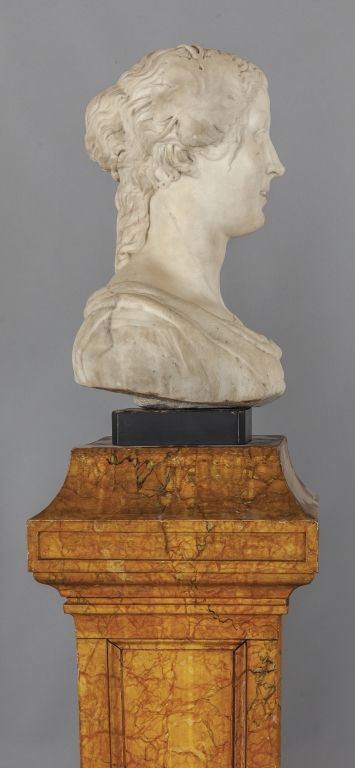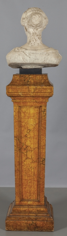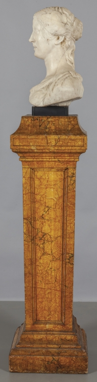Busto di giovane donna con nastro tra i capelli scultura in marmo bianco statuario sec. XVII-XVIII poggiante su colonna liberty in legno marmorizzato