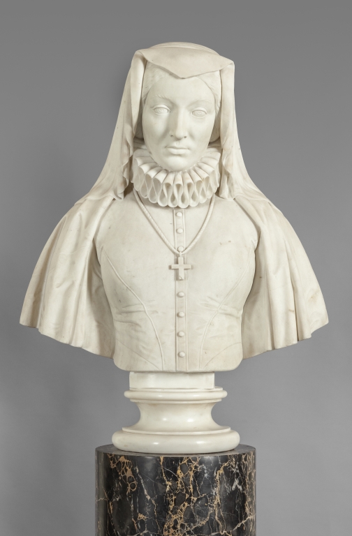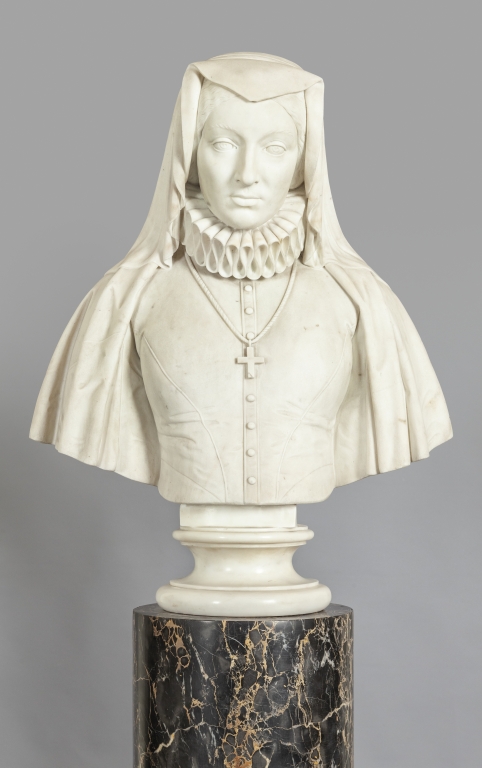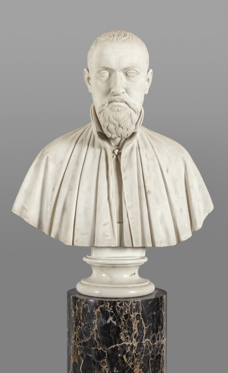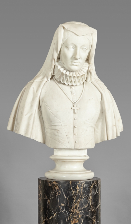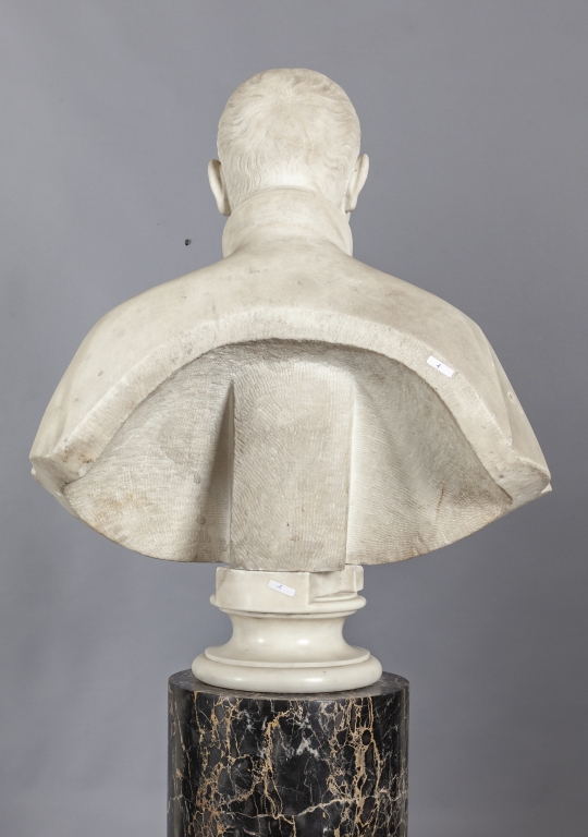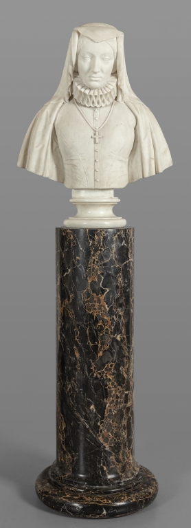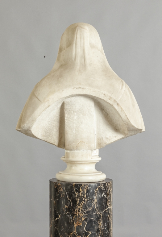 'Gentiluomo con colletto rigido' e 'Gentildonna con abito monastico' coppia di importanti busti in marmo bianco statuario poggianti su basi in marmo portoro Genova sec.XIX