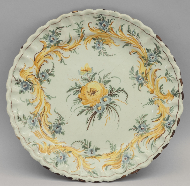 Grande piatto in ceramica modello argenteria decorazione in policromia su fondo bianco Savona sec.XVIII