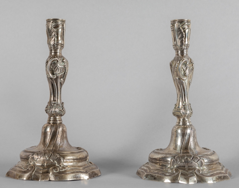 Coppia di candelieri Luigi XV in argento finemente sbalzato Palermo sec.XVIII