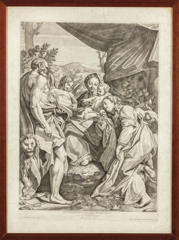 'Madonna di San Girolamo detta Il Giorno' stampa da Correggio dedicata a Francesco Farnese duca di Parma e Piacenza incisa a Parma da M.Fontana sec.XVIII