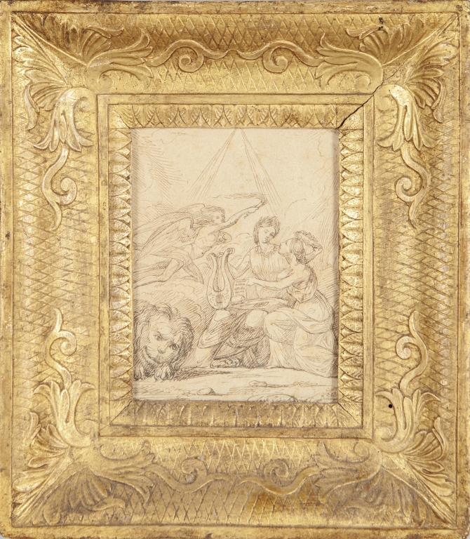 'Scena neoclassica' disegno f.to in b.a ds. cornice in legno finemente intagliato e dorato