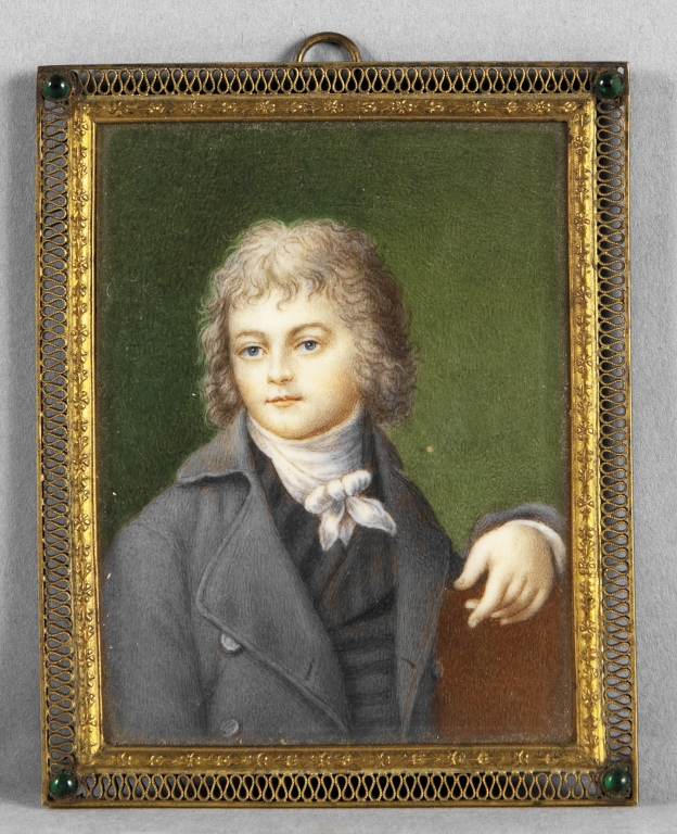 'Giovane gentiluomo' miniatura su avorio sec.XIX cornice coeva in metallo traforato