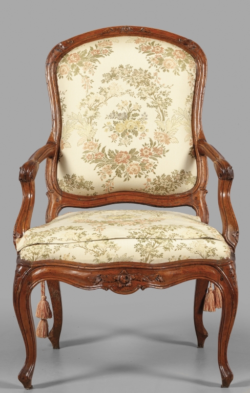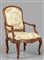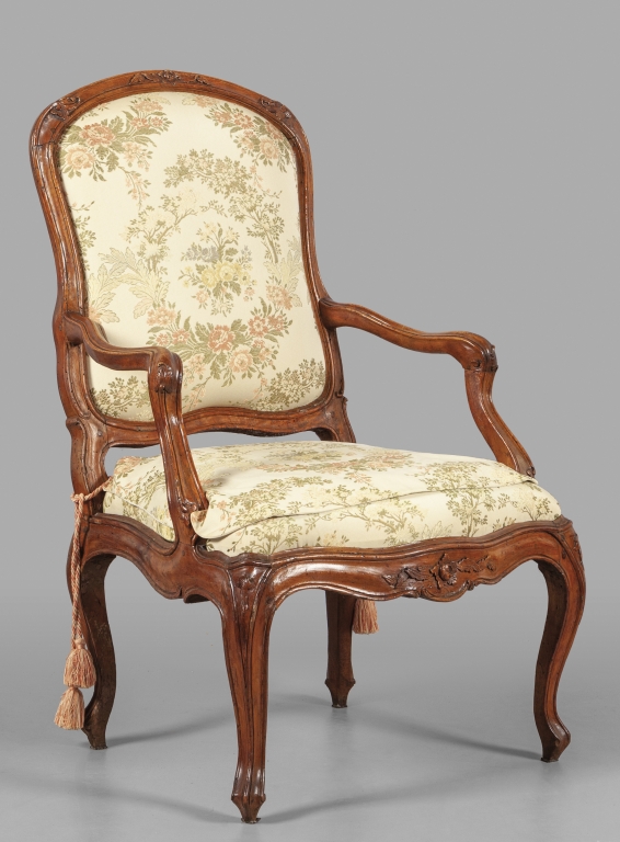 Poltrona Luigi XV in noce decorazione a pellacce Genova metà sec.XVIII