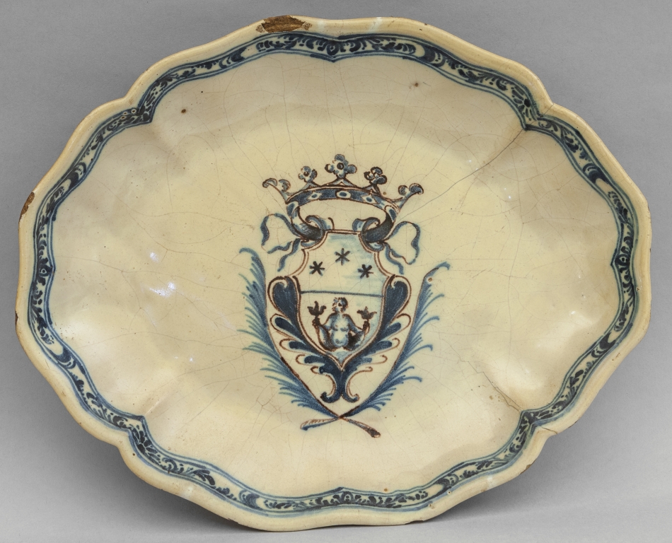 Vassoio sagomato in ceramica decorata in policromia su fondo bianco al centro stemma nobiliare Savona sec.XVIII