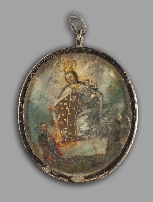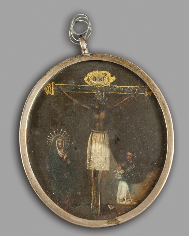 Antico medaglione di forma ovale a due facce raffiguranti la Vergine in trono e la Crocefissione sec.XVIII