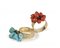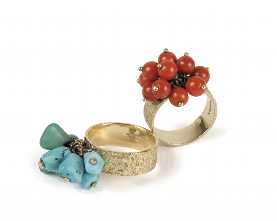Coppia di anelli in oro giallo con montati coralli e turchesi tremblant