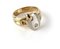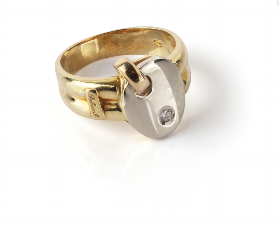Anello in oro giallo e bianco con parte centrale a forma di scudo ovale e piccolo brillante