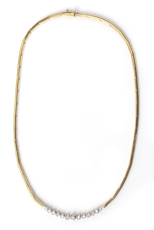 Girocollo in oro bianco e giallo formato da maglie modulari con incastonati nella parte centrale tredici diamanti taglio brillante per tot ct 0 35 circa