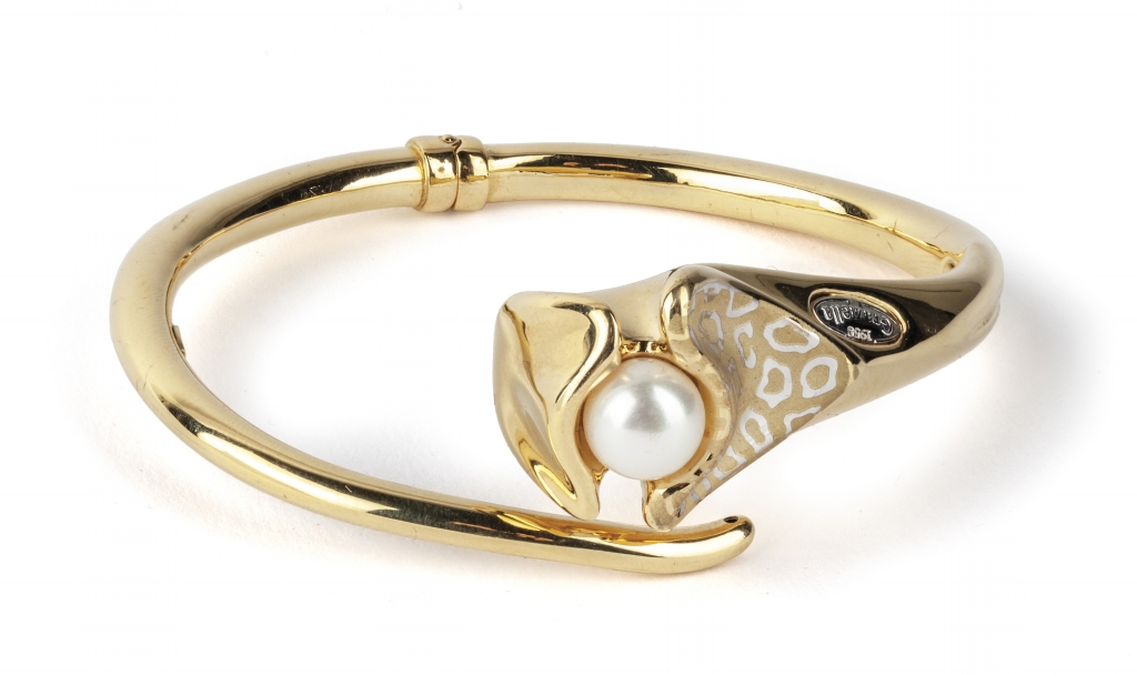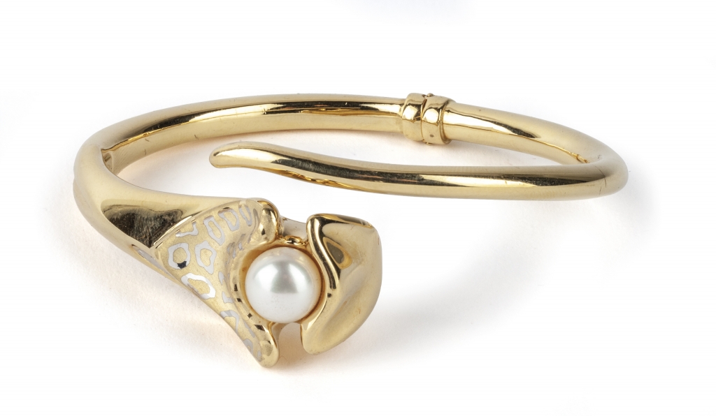 Bracciale in oro giallo firmato Graziella di forma rigida con montata una perla d'acqua dolce