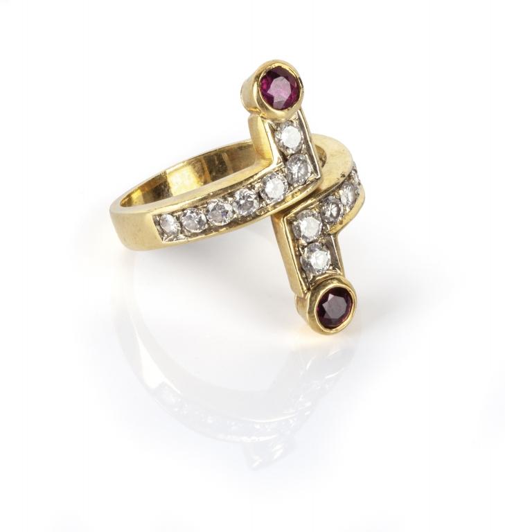 Anello a forma di contrarier in oro giallo con incastonati diamanti taglio brillante per tot ct 0 70 circa e due rubini taglio rotondo per tot ct 0 30 circa