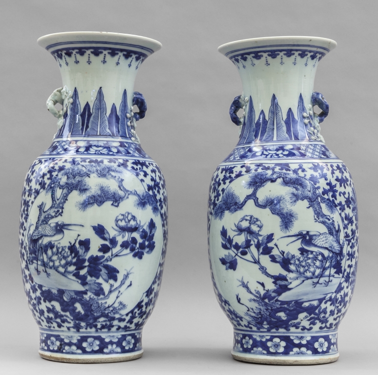 Coppia di vasi in porcellana di Cina decoro bianco e blu a riserve con alberi e fiori Cina sec.XIX