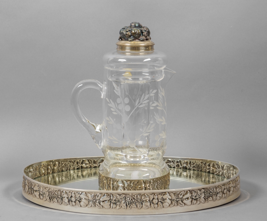 Vassoio ovale con bordo in argento sbalzato con frutta e brocca en suite
