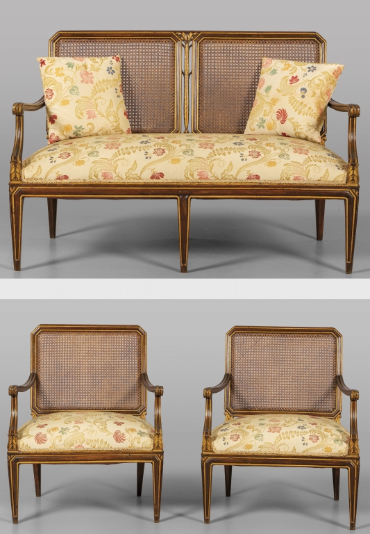 Coppia di divanetti e coppia di poltrone analoghe in noce e oro