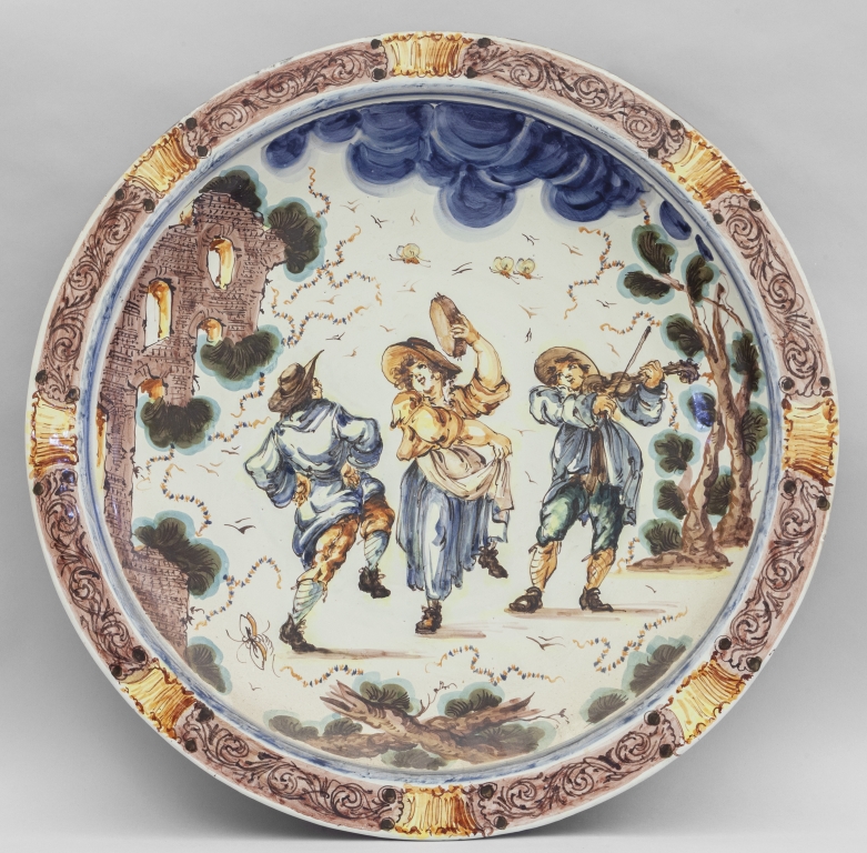 Grande piatto in maiolica di Savona decorato con figure in un paesaggio f.to nel retro Ravano e d.to 1937