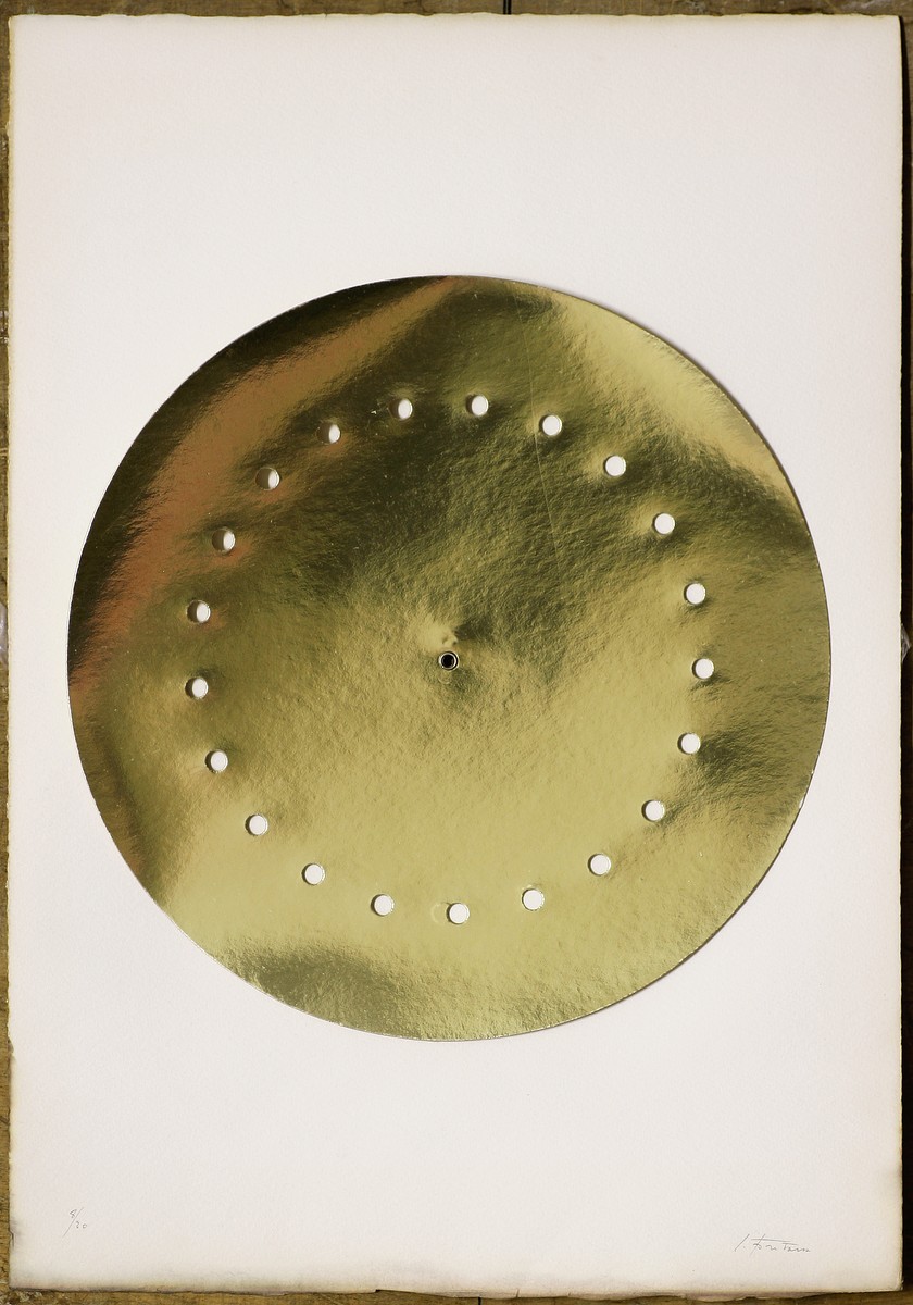 Anni '60. Tiratura: 8/30. L'opera faceva parte di un'edizione, comprendente ventuno esemplari firmati dagli artisti Lucio Fontana, Heinz Mack, Gunter Ueker e Nanda Vigo, curata Mario Arcaini, Edizioni La Quercia, Milano 1966. Dimensioni disco: 30 Cm. Firmato e numerato in basso a matita