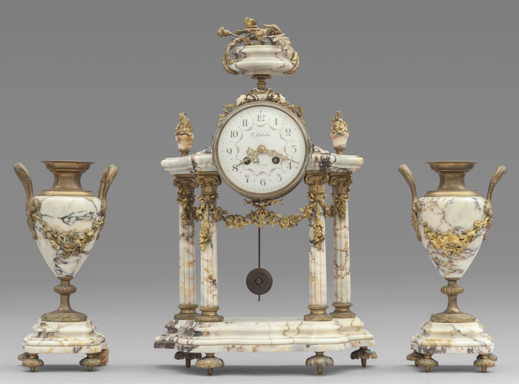 Trittico da camino in marmo e bronzo quadrante f.to E.Gubelin Francia fine sec.XIX