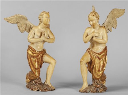 Coppia di angeli oranti in legno finemente intagliato dorato e laccato Veneto sec.XVIII