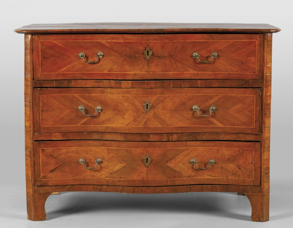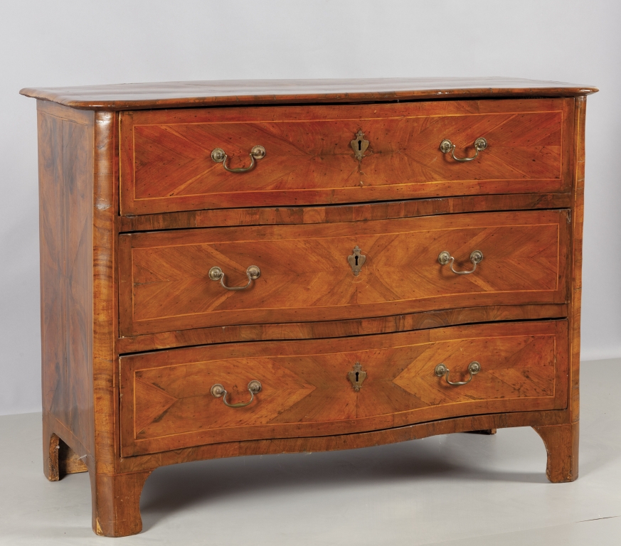 Comò Luigi XIV lastronato e filettato a tre cassetti piano in legno Piemonte sec.XVIII