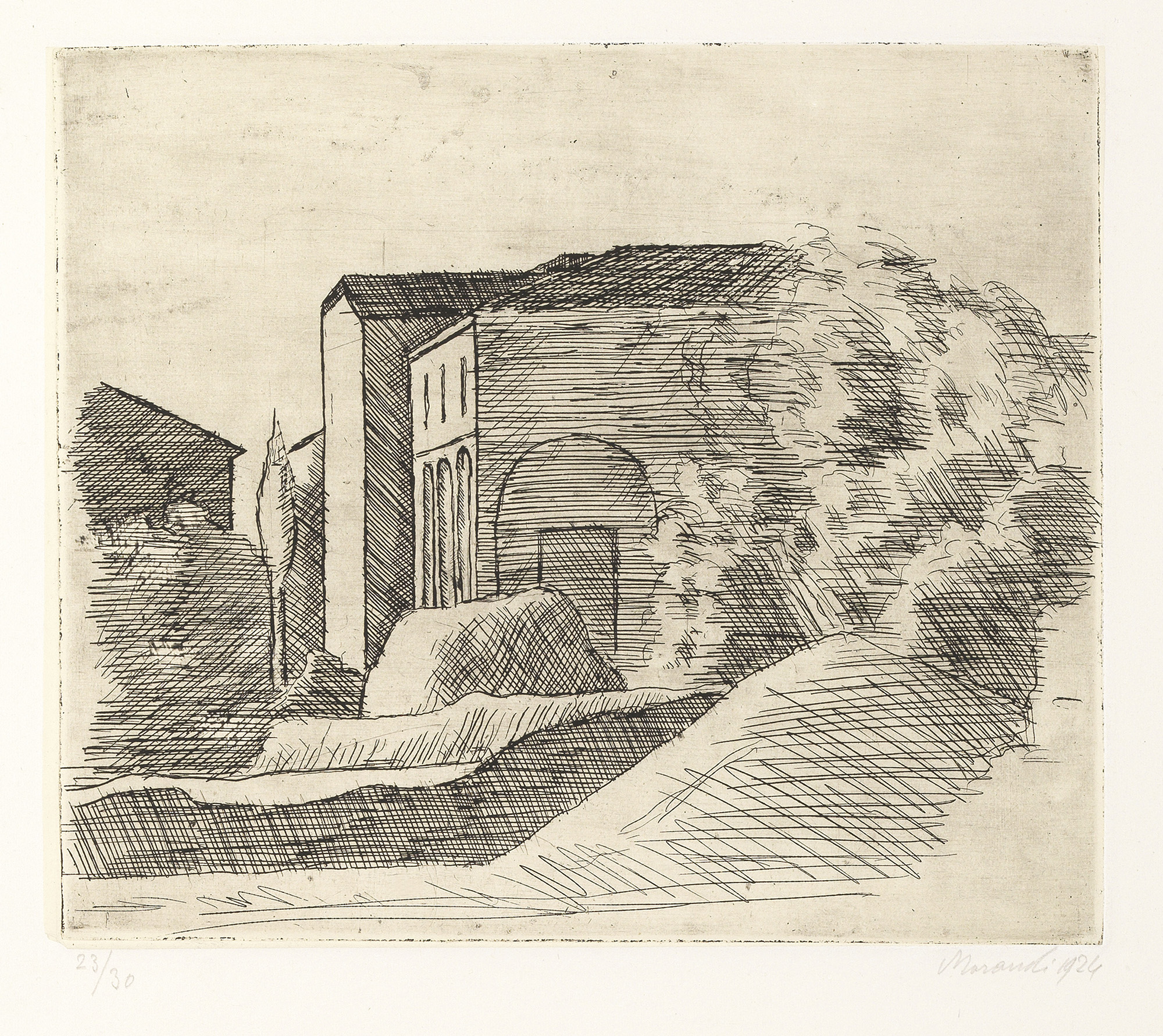 Giorgio Morandi Bologna 1890 - 1964 La casetta con il portico e il cipresso (lastra grande), 1924 Acquaforte su zinco su carta India incollata, es. 23/30, cm. 20,1x23,5 (lastra), cm. 28,3x43,5 (carta) Firma e data a matita sul margine in basso a destra: Morandi 1924, tiratura in basso a sinistra: 23/30. Storia: Collezione Giancarlo Pasi, Ravenna; Collezione privata Primo stato su due, tiratura di 30 esemplari numerati, di cui alcuni su carta India incollata e due prove. Bibliografia: Lamberto Vitali, L'opera grafica di Giorgio Morandi, Giulio Einaudi Editore, Torino, 1964, n. 21; Michele Cordaro, Morandi incisioni. Catalogo Generale, Edizioni Electa, Milano, 1991, p. 22, n. 1924 1