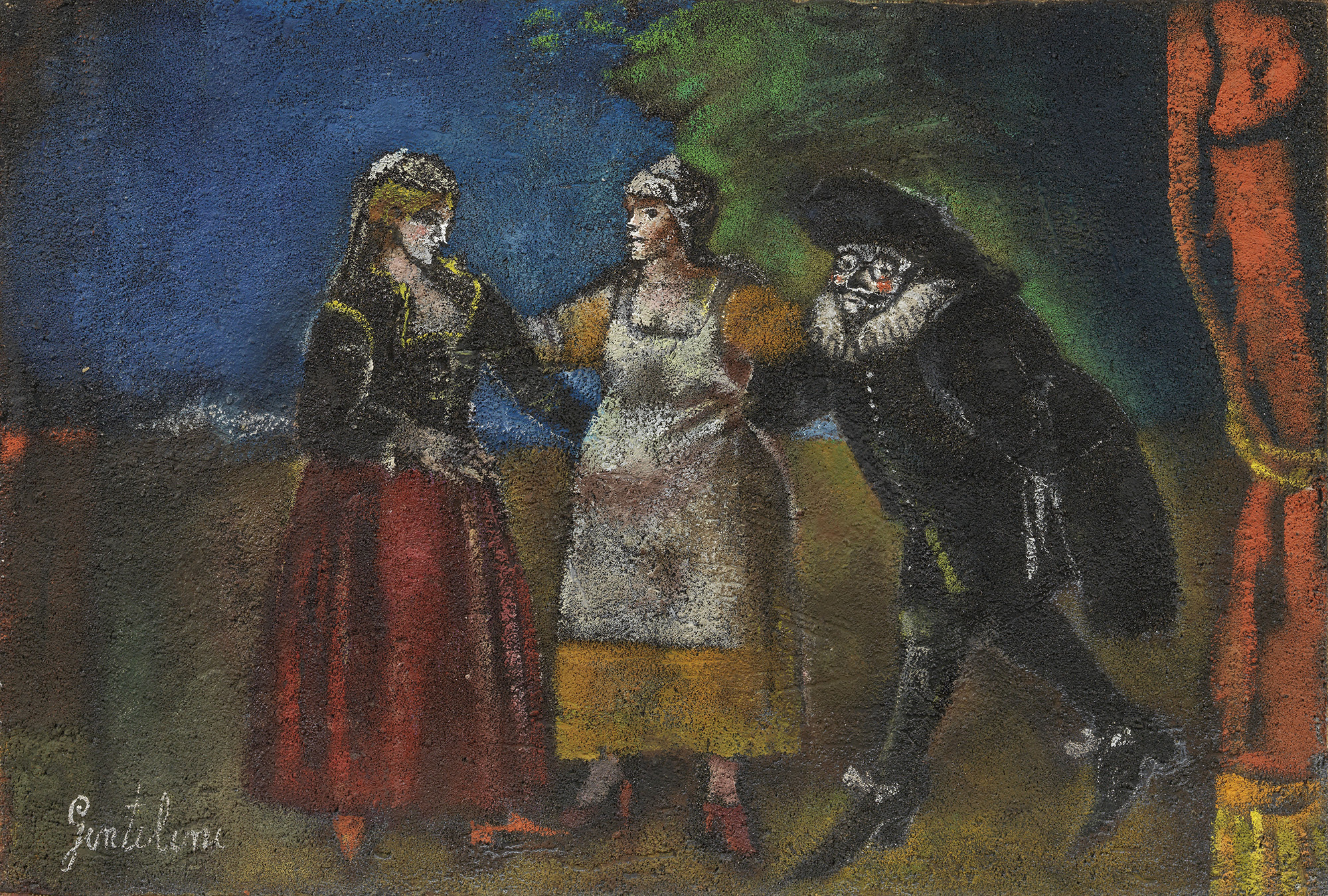 Franco Gentilini Faenza (Ra) 1909 - Roma 1981 Isabella, Rosetta e Signor Graziano, 1977 Olio su cartone sabbiato applicato su tela, cm. 26,5x38,5 Firma in basso a sinistra: Gentilini. Storia Collezione G. Cesari, Argenta; Collezione privata Foto autenticata dall'artista, Roma, 5 dicembre 1979. L'opera è il bozzetto per la terza acquaforte-acquatinta del terzo gruppo della cartella Le Maschere di Gentilini, Roma, 1977. Bibliografia Luciana Gentilini, Giuseppe Appella, Gentilini. Catalogo generale dei dipinti 1923-1981, Edizioni De Luca, Roma, 2000, p. 679, n. 1582.